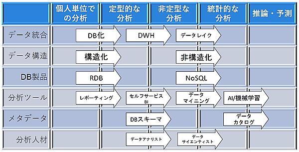この企業のデータ分析の高度化ステップを理解することで、システム企画担当者は、自社の現在地を把握し、より高度なレベルに上がるために、どのような課題を克服する必要があるのかを知ることができます。