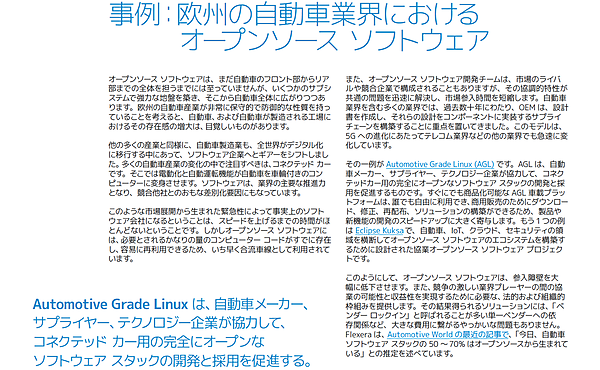 このレポートには、欧州の自動車業界におけるオープンソース ソフトウェアの事例として、Automotive GradeLinux(AGL)とEclipse Kuksaが紹介されています。