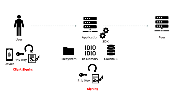 これらのWalletはユーザー側でなくアプリケーションを実行するマシンに秘密鍵を置きますが、ユーザー側に秘密鍵を置き署名することができます(Client Signingとも、Offline Private Keyとも呼ばれる)。これは、携帯電話の指紋認証や生体認証などの特別なデバイスでユーザーの秘密鍵を管理する場合に利用します。