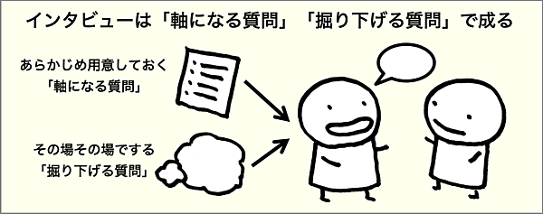 インタビューでする質問は、あらかじめ用意しておく「軸になる質問」と、インタビュー対象者の回答に応じてその場その場でする「掘り下げる質問」の2種類があります。