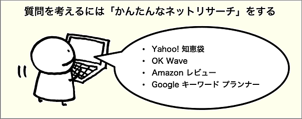 インタビューの質問を考えるには、いくつかの方法があります。ブレーンストーミングや、これまでのプロジェクトの中で浮かんだ仮説を質問にする方法などがありますが、筆者は自分でできる「かんたんなネットリサーチ」をしてみることをオススメしています。