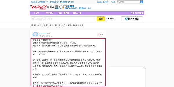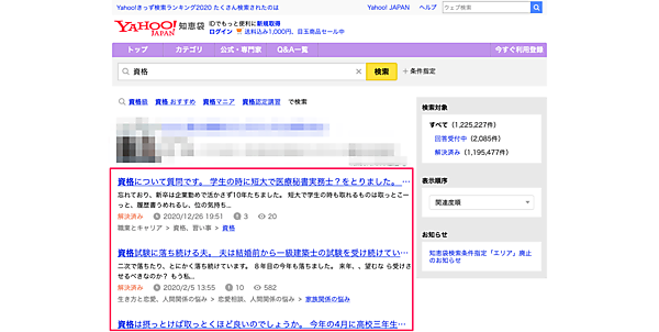 「Yahoo! 知恵袋」を開いて、調べたいキーワード(今回であれば「資格」)で検索します。出てきた記事をひとつずつ見て「資格を取得したいと思うきっかけ」をメモしていきましょう。「Yahoo! 知恵袋」の、特に「質問文」には、ユーザーがそのキーワードにおいて、どんなことを不安に思うか、疑問に思うかが、あらわれてきます。