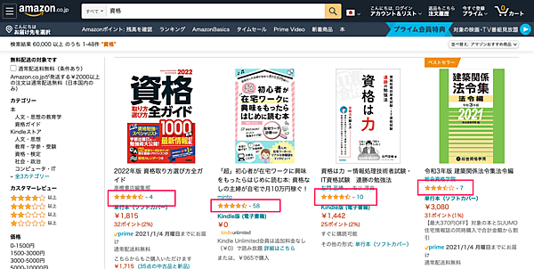 ここでも、「資格」でキーワード検索し、上位に出てきた書籍の「レビュー」を見ていきます。
