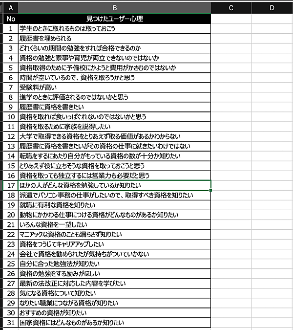 見つけたユーザー心理をスプレッドシートに一覧にしたものを次に示します。