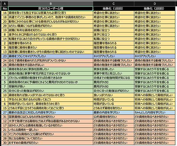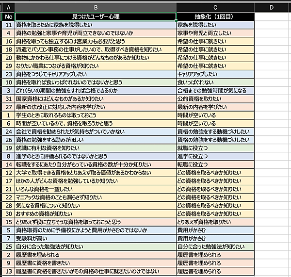 ただ、この状態では散漫で、何を読み取れば良いのか戸惑います。そこで、第4回 ユーザーの発話を「そのまま」信じてはいけない。では、どうする?で出てきた「抽象化」をしていきます。似た心理をグループにして、グループ名をつけていきます。