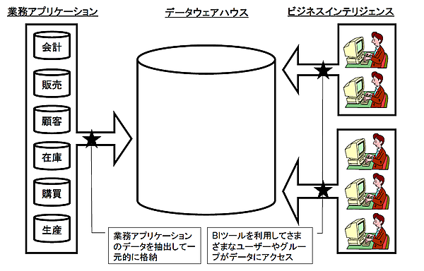 データウェアハウスとは、データ分析システムで利用可能とするデータを一元的に格納するデータベースのことです。データウェアハウスに格納されたデータは、BIツールを通じてさまざまな分析に利用されます(図1)。