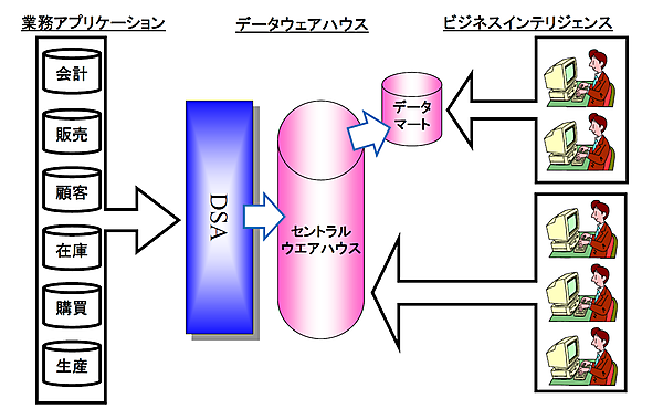 データウェアハウスの本体となるデータベースです。通常、リレーショナル・データベースが使用されます。 - DSA(データステージングエリア)