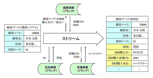 セントラル・ウェアハウスに格納される各テーブルを構成する情報(カラム)は、多くの場合、複数のテーブルもしくは複数の業務システムに分かれて存在しています。このような複数のソースデータから1つのセントラル・ウェアハウスのテーブルを作成するのに必要な処理が統合化です。通常、統合化は1つのテーブルに対して一連の連続した処理、つまり1つのストリームで処理します。図4はストリームの例です。