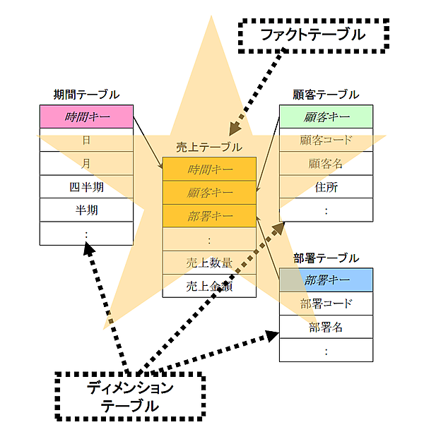 多次元分析で行われる軸の入れ替え、スライス、ドリルダウン&ドリルアップといった操作を可能にするには、スタースキーマと呼ばれる特別なデータベース構造を持たせる必要があります。そのため、データウェアハウス(セントラル・ウェアハウス及びデータマート)の中でBIツールから直接アクセスされる部分はスタースキーマで作成されます。