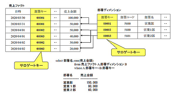 そこで、データウェアハウスではサロゲートキーとして営業部は0001番、営業1部は0002番、営業2部は0003番というように通番を振ります。これにより、集計した結果がきちんと営業部、営業1部、営業2部に分かれて出てくるようになります(図6)。