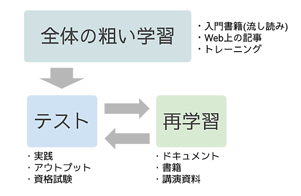 学習に大きく寄与するのはテストと再学習ですが(後述)、何をするにも、まず最低限検索の材料となる程度の知識をインプットする必要があります。何も知らない状態でテストをしても「何が分からないか分からない」状態になってしまうでしょう。この前段階の学習方法は様々ですが、何よりも挫けないことが大切です。