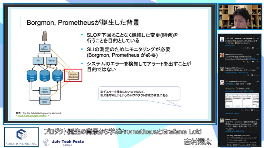 ゼットラボ株式会社の吉村翔太さん(@yosshi_)による「プロダクト誕生の背景から学ぶPrometheusとGrafana Loki」セッションです。このセッションでは「PrometheusとGrafana Lokiがどのような背景から生まれたのか」という切り口で解説しています。