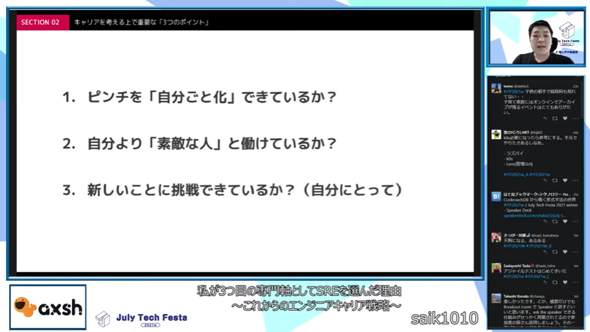新しいことへの挑戦は、専門軸を増やしていくことになる。複数の専門軸を掛け合わせれば、より希少性の高い人材になっていく。斉藤さんは自身にとっての新しい専門軸はSREであり、SREを選んだ理由と経緯を語りました。