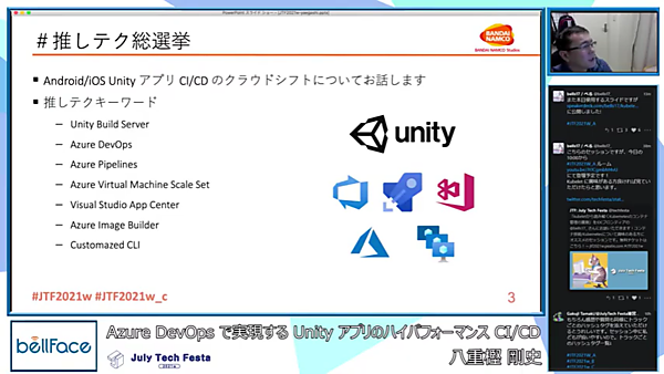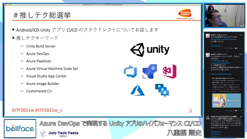 株式会社バンダイナムコスタジオの八重樫 剛史さん(@hogegashi)による「Azure DevOpsで実現するUnityアプリのハイパフォーマンスCI/CD」というテーマのセッションです。