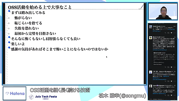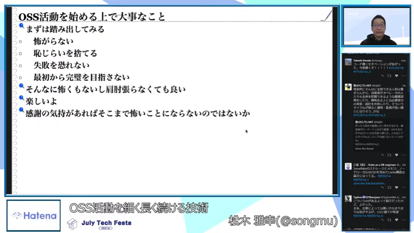 OSS活動は、エンジニアであれば誰しも憧れを抱く取り組みだと言える一方で、OSSにコントリビュートしていくことは敷居が高そうだとも言われています。しかし「自分の普段使いの道具をOSSにする」「とりあえずpull requestを送ってみる」という、松木さんの実体験に即した言葉に奮い立たされた方、励まされた方は大勢いたのではないでしょうか。実際に「発表を見て行動を起こしました」とブログに書かれた方もいらっしゃいました。JTFをきっかけにこういった動きが生まれることは運営として嬉しいかぎりです。OSS活動に興味のある方には、ぜひ本セッションの動画をご覧いただきたいです。