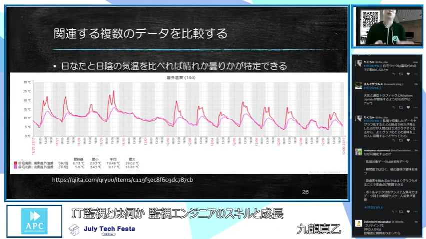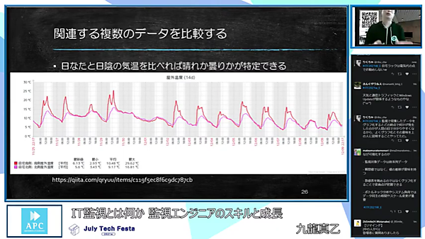 監視システムを扱うに当たっては「監視するものに対しての事前知識を持つ必要がある」ことを訴えかける内容でした。視聴者により理解を深めてもらうため、温度・気圧センサーから取得した監視グラフを例として挙げて説明しました。