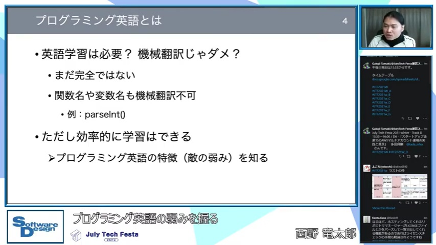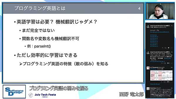 プログラミングでは英語が頻繁に使われます。例えばソースコードには関数名や変数名、コメントなどがあります。ここで使われる英語には独自の「特徴」があり、機械翻訳では完全な翻訳はまだ難しいのが現状です。よってプログラミングをするには英語の学習が必要となってきますが、「プログラミング英語の特徴(=敵の弱み)を知ることで効率的に学習できる」という内容でした。