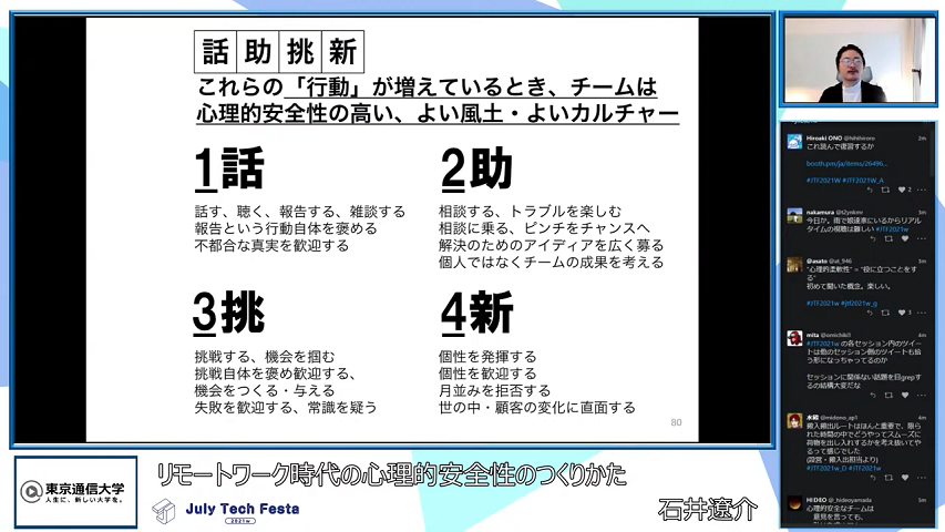 書籍『心理的安全性のつくりかた』(日本能率協会マネジメントセンター刊)の著者である、株式会社ZENTech 石井遼 介さん(@ryouen)による、「リモートワーク時代の心理的安全性のつくりかた」というテーマのセッションです。現代社会における心理的安全性の必要性、心理的安全性を高めるための行動やリモートワーク時に有効な3つのTIPSなどを解説しました。