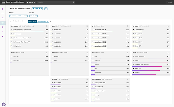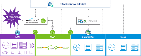 VMware社は、2020年1月に企業内LANのAIOpsプラットフォーム「Nyansa Voyance」を提供するNyansa社を買収し、VMware SD-WANへの統合を発表しました。現在は「VMware Edge Network Intelligence」と再ブランディングされて提供しています。VMware SD-WANのエッジデバイスを展開時に分析機能を有効にすることで容易に連携できるようになっています。