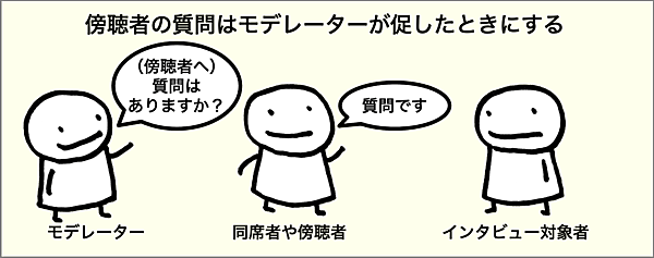 全体のタイムスケジュール感と「傍聴者からの質問は、インタビューの最後にモデレーターが促す(ので安心して聴いていてください)」ことを傍聴者に伝えます。特にインタビューを傍聴していると「あれもこれも訊いてみたい」という考えがよぎるので、質問できる時間があることを知らされていないと、やきもきしたり、インタビューに割って入ろうとしたりしてしまいます。