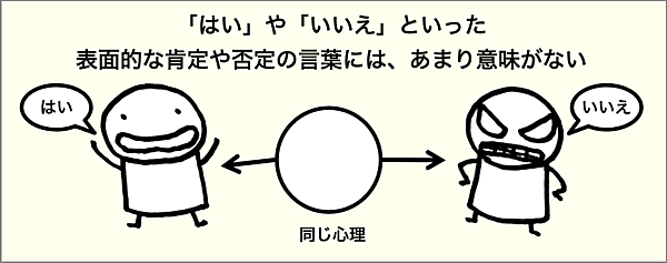 実はユーザーの発言のうち「はい」や「いいえ」といった表面的な肯定や否定の言葉には、あまり意味がありません。言ってしまえば「はい」と「いいえ」はどちらでも良いのです。重要なのは、それに続いて「なぜですか?」と質問をして、背景にある心理を深掘りすることです。