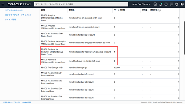 では、最初にサービス制限を確認しておきましょう。Oracle Cloudではデフォルトで、それぞれのサービスごとに、どれぐらいの数を立ち上げられるか上限値が設定されています。HeatWaveを使うために必要なリソースが利用できるか確認します。足りなかったら制限の引き上げを申請することになります。
