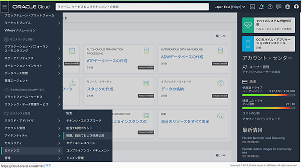 コンソール左上にある三本線のハンバーガーメニューをクリックすると、コンソールメニューが表示されます。ここで、「ガバナンス」→「制限、割当ておよび仕様状況」を選ぶとサービス制限の設定画面が表示されます。