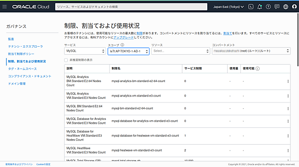 サービス制限の設定画面では、「サービス」で「MySQL」を選びます。そして「スコープ」で使う可用性ドメインを、東京リージョンがあれば、何か文字列のあとに「:AP-TOKYO-1-AD-1」のようになっている項目を選びます。これで制限の一覧が表示されます。