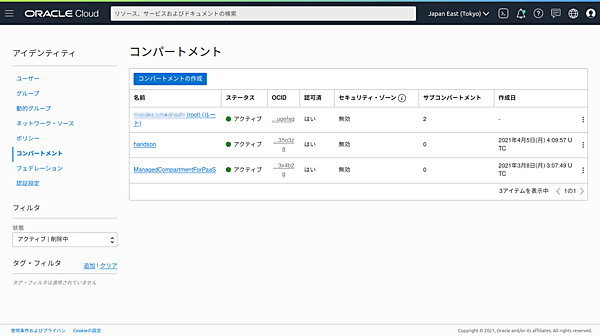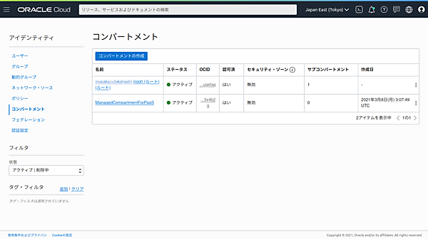コンソールメニューから「アイデンティティ」→「コンパートメント」を選択すると、すでに作られているコンパートメントの一覧が表示されます。