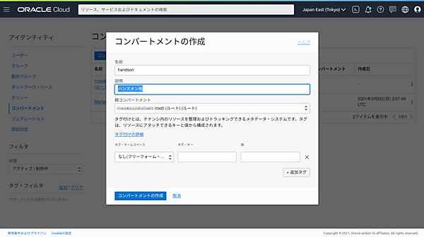 ここで「名前」と「説明」を入力します。ここでは仮に、名前を「handson」、説明を「ハンズオン用」としておきます。入力が終わったら、「コンパートメントの作成」をクリックします。