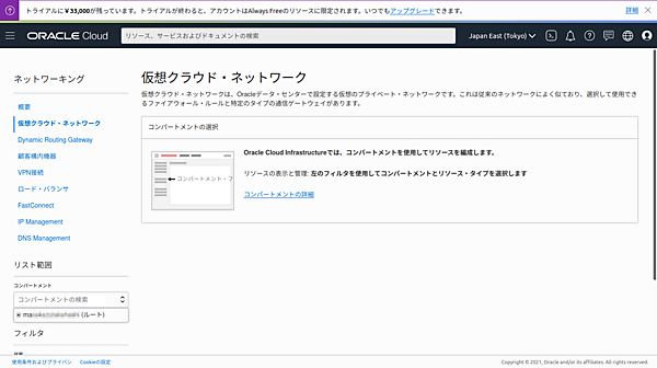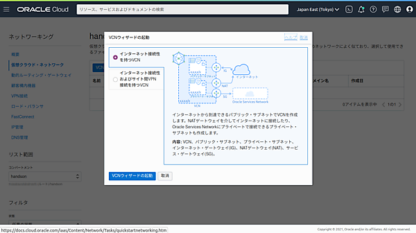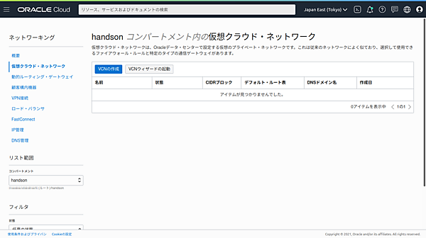 そうです。まず、コンソールメニューから「ネットワーキング」→「仮想クラウド・ネットワーク」を選択してください。ここで、初めての場合は、まずコンパートメントを選択するよう求められると思うので、画面左の「コンパートメント」から、先ほど作成した「handson」を選ぶのを忘れないように。