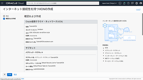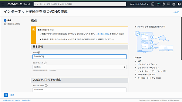 ここではVCN名だけ入力すれば十分です。仮に「TutrialVCN」としましょう。念のため、コンパートメントが「handson」になっていることも確認しておきます。「VCNとサブネットの構成」でネットワーク情報も設定できますが、ここではそのままでかまいません。