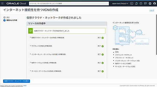 「仮想クラウド・ネットワークが作成されました」と表示されました。