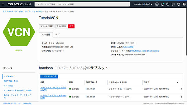 これでVCNが作成されました。画面左下の「仮想クラウド・ネットワークの表示」をクリックすると、VCN(TutorialVCN)の情報が表示されます。この中で「handsonコンパートメントのサブネット」のところに、「プライベート・サブネット」と「パブリック・サブネット」の2つが作成されていることがわかると思います。「パブリック・サブネット」はインターネットにつながっている側、「プライベート・サブネット」はインターネットにつながっていない側です。