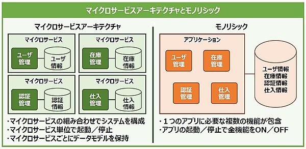 まずは、マイクロサービスアーキテクチャについて説明していきましょう。マイクロサービスアーキテクチャを説明するためには、「モノリシック」なサービスと対比するとわかりやすいでしょう。図1に2つの構造を並べてみました。