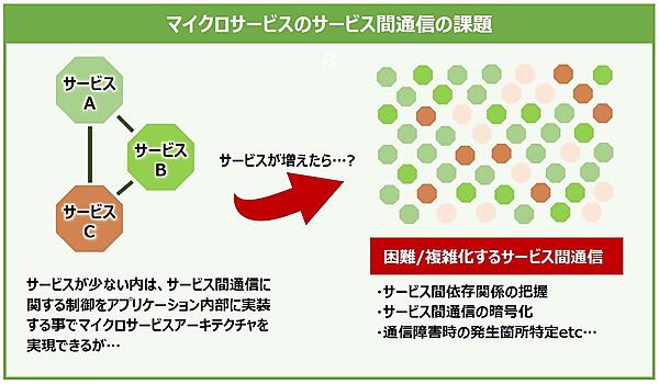 さて、先に触れたようにビジネスにおけるメリットが大きいマイクロサービスアーキテクチャですが、全てを解決してくれるわけではありません。サービスの規模が大きくなり、個々のサービス(機能)間の通信が複雑化していくにつれ、マイクロサービスならではの課題が表れてきます。