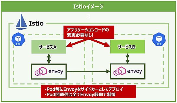 Istioは、ライドシェアサービスを展開するLyft社が社内システムの構築用に開発した「Envoy」をベースに、GoogleやIBM、Lyftの3社が協力して開発したサービスメッシュのオープンソースプロジェクトです(※Istioはギリシャ語で「Sail」(帆)を意味します)。Istioの大きな特徴は、KubernetesのPodごとにEnvoy(Proxy)をサイドカーとしてデプロイすることでPod間通信を全てEnvoy経由で制御し、管理できるところにあります(図4)。
