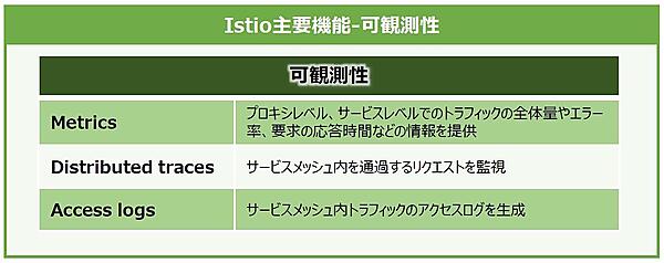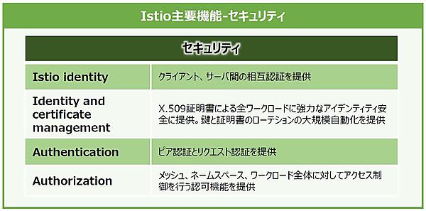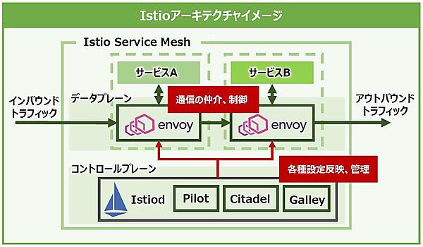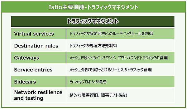 Istioは図5の各コンポーネントを用いてトラフィックマネジメント、セキュリティ、可観測性の3つの主要機能を実現します。
