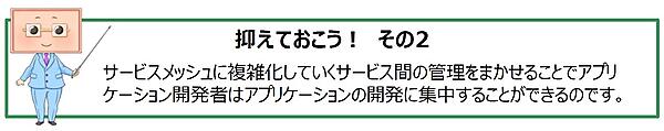 ここでは、Istioなどのサービスメッシュコントロールプレーンを使用すると、Kubernetesなどによるマイクロサービスアーキテクチャが抱えるサービス間通信の課題を解決できることを覚えておきましょう。