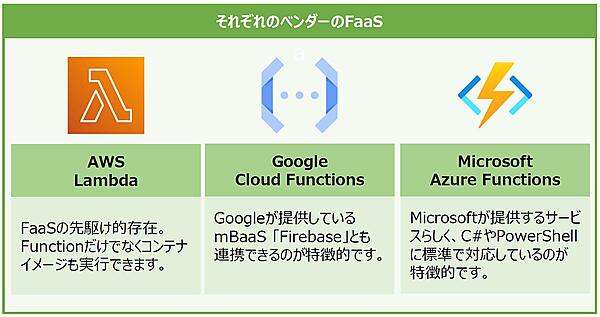 Functionは日本語で表すと関数という意味で、ITの世界では入力した値に対して何かしらの処理を実行し、その結果を返してくれるプログラムの部品と捉えることができます。その入力イベントを起点としてプログラムの処理がクラウド上で実行されるサービスがFaaSなのです。AWSの「Lambda」、Googleの「Cloud Functions」、Microsoftの「Azure Functions」などが有名ですね(図9)。