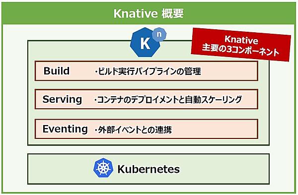 「Knative Build」は「Tekton」という名前のCI/CDパイプラインツールとして独立して存在するようになり、現在のKnativeでは「Knative Build」「Knative Serving」と「Knative Eventing」のみで構成されます(※Tektonを含めた3つのCI/CDパイプラインツールを組み合わせてサーバーレス環境を作り上げるため、最後にTektonも併せて取り上げます)。また、これらのコンポーネントはKubernetesの拡張リソースであるCRD(Custom Resource Definition)で組み立てられているため、他のKubernetesのリソースのマニフェストと同じようにYAML形式で記述できます。