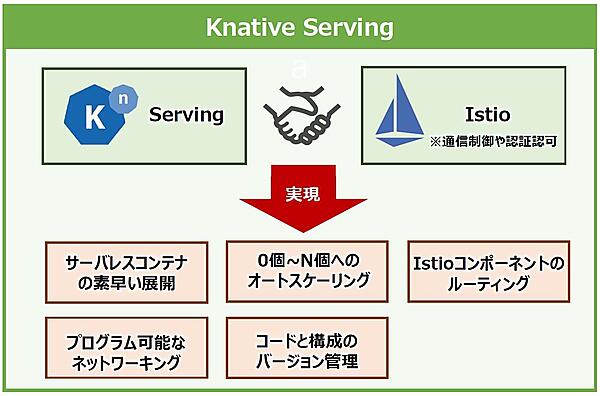 Knative Servingを支えているのはIstioです。Istioの通信制御や認証・認可の機能によりサービス間接続を制御し、コンテナのアプリケーションと関数のデプロイをサポートします。またKnative Servingは簡単に開始でき、高度なシナリオをサポートするように拡張もできます。
