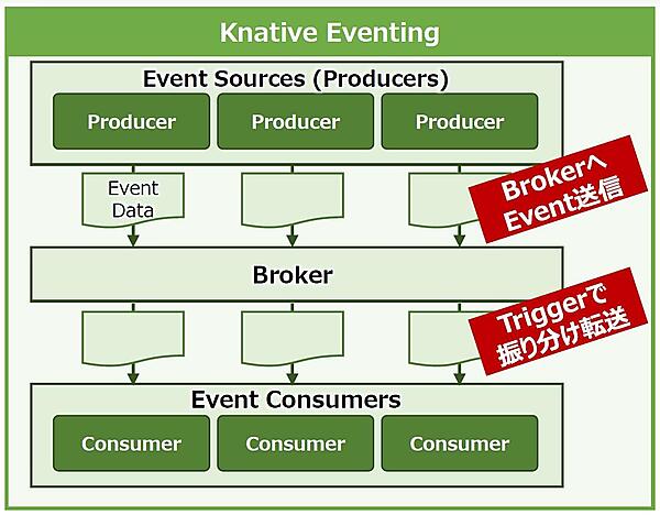 Knative Eventingはその名の通りイベント処理を実現します。KnativeをFaaSのようにイベント受信を契機に処理を実行させるために必要なコンポーネントです。Knative Eventingはイベントソースとイベントコンシューマいう概念に分かれており、汎用的なイベント連携インターフェースを備えています。各イベントのデータはイベントソースからBrokerへ送信され、別途設定するTriggerにより適切なConsumerへ振り分けて転送される流れになっています(図12)。