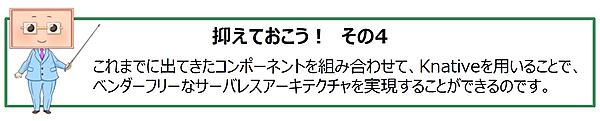 そこでクラウドベンダーに捉われずに、コンテナの特徴の1つである「どの環境でも動かすことができる」メリットを活かしてサーバーレスアーキテクチャを実現してくれるのが「Knative」です。