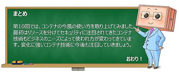 今回は、コンテナを使い方の一例として、やや難しめの「マイクロサービス」と「サーバーレス」について紹介しました。ここまでの全10回で本連載はいったん終了にしたいと思います。ざっくりとでも、コンテナがどのようなもので、どこでどうやって使われるかを理解できたのではないでしょうか。