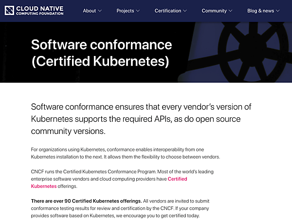 また、Cloud Native Computing Foundation(CNCF)は「Certified Kubernetes Conformance Program」(認定Kubernetes 適合性プログラム)を実施しています。この適合性プログラムは、すべてのベンダーのKubernetesのバージョンが、オープンソースコミュニティのバージョンと同様に必要なAPIをサポートすることを保証するものです。現在、90以上のCertified Kubernetesが提供されています