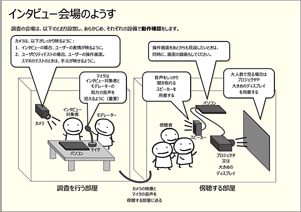 リモートのインタビューでは「インタビュー対象者のようすをちゃんと中継できるか」が大きなポイントになります。途中でユーザビリティテストをする場合、画面共有をしてもらうのか、スマホアプリの場合はどのようにして画面を中継してもらうのかを考えておく必要があります。
