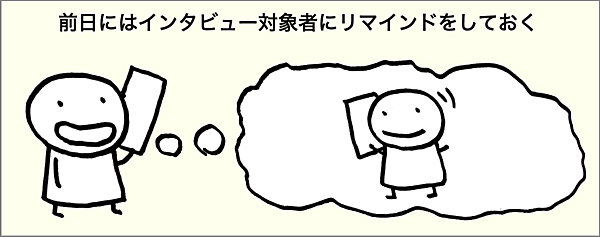 インタビューの前日には、インタビュー対象者にリマインドの連絡をしましょう。筆者は、できるなら電話が好ましいと思っています。メールやメッセージだと見落とす可能性があるのと、事前に電話で話をしておくことで当日の初対面感が少し薄れ、インタビューがしやすくなるためです。またリマインドすることでドタキャンのリスクを減らすことができます。