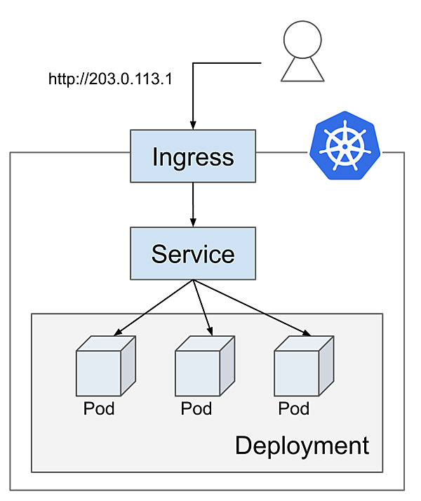さて、Serviceを設定することにより、Deploymentで作成したPodへ通信を振り分ける仕組みが完成しましたが、現時点では、このサービスにはクラスタ内部からしかアクセスできません。クラスタ外部からもアクセスできるように、Ingressを使って公開しましょう。