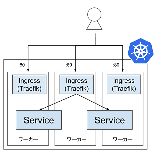 さて、本連載ではIngressを利用してサービスを外部公開します。Ingress ControllerにはTraefikを利用します。TraefikをDaemonSetモードで利用すると、各ノードの80番ポートで通信をリッスンきます。結果的にNodePortと似たような構成に見えますが、関連性はなく仕組みの異なるものです。あくまで、LoadBalancerとしてTraefikが各Workerに配置されていると考えてください。